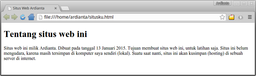 Kita ingin menampilkan informasi di website. Informasi ini merupakan sebuah pesan: Situs web ini milik Ardianta. Maka bentuk kode HTML-nya akan seperti ini: